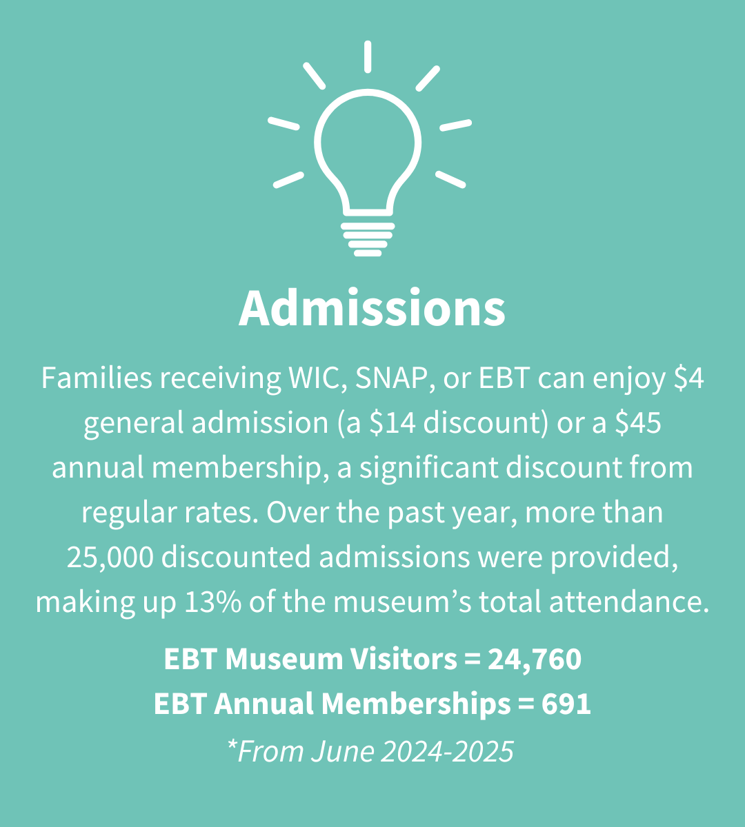 EBT Program: CMON has joined the Museums for All initiative that provides access for EBT, SNAP, and WIC cardholders. Museum fees can be a barrier for many under-resourced families. Cardholders receive a deep admission and membership discount when shown with a photo ID.